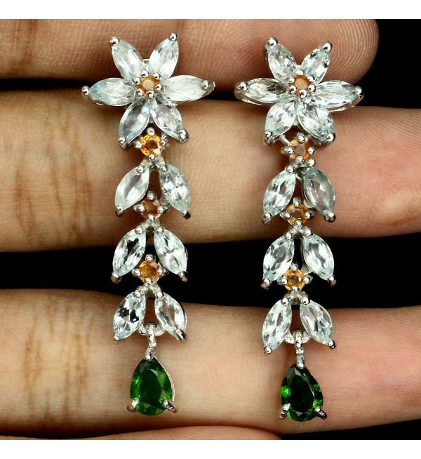 Серебряные серьги подвески с натуральным аквамарином, хромдиопсидом, сапфиром "Эйфория"