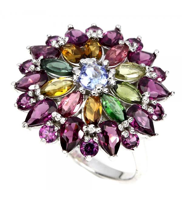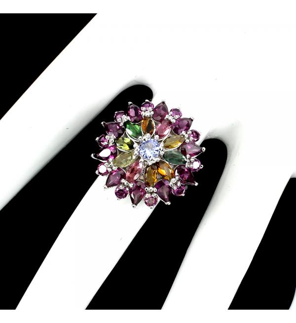 Серебряное кольцо с драгоценными камнями: танзанит, родолит гранат, турмали купить в Киеве