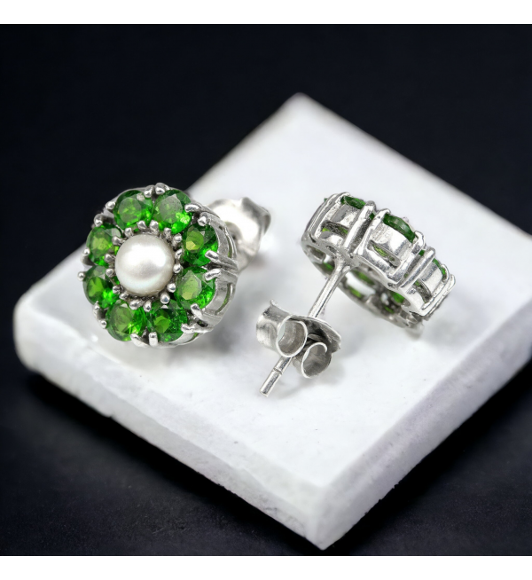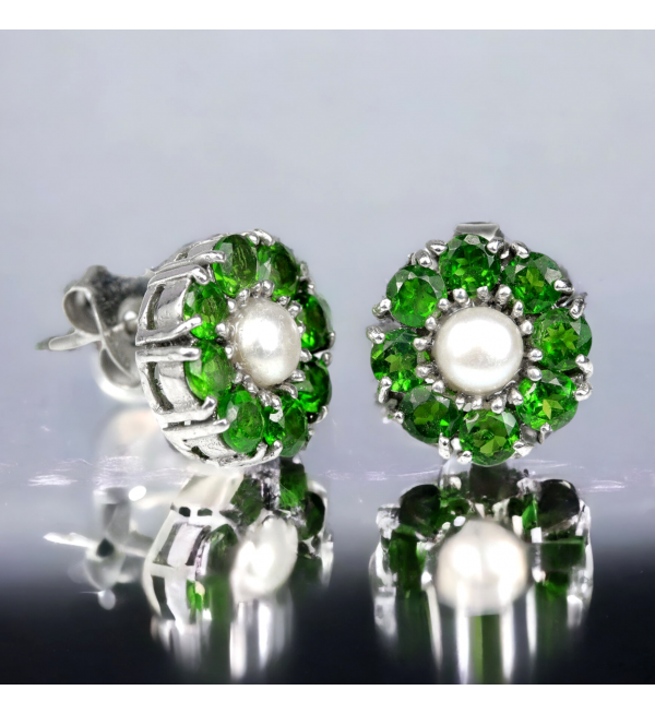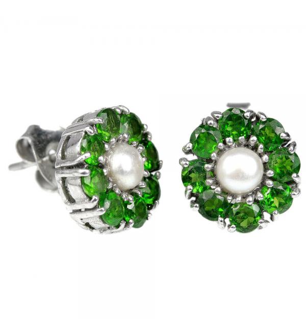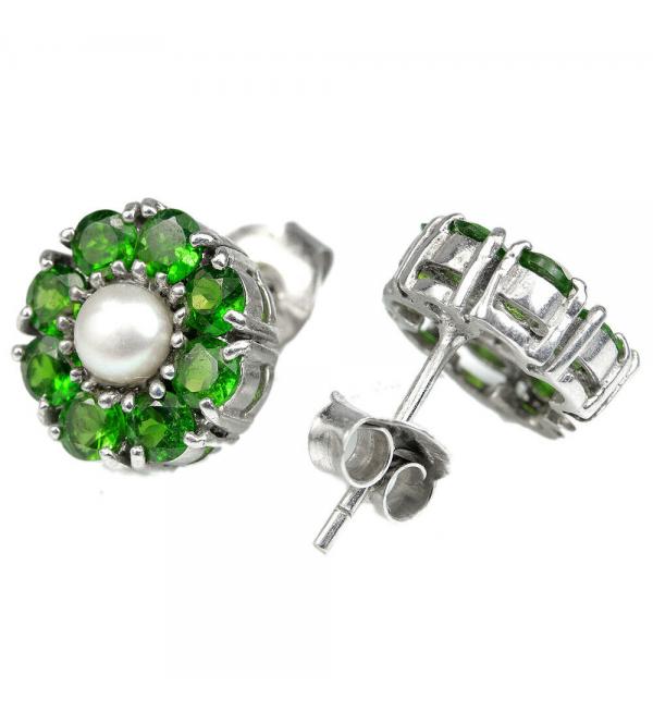 Купить серебряные серьги с натуральным хромдиопсидом и жемчугом в Киеве можно в ювелирном интернет-магазине TOPGEMS.