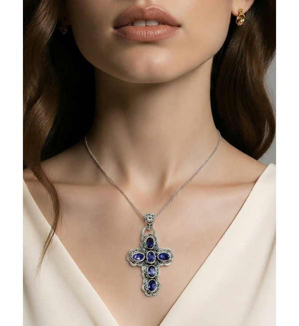 Крестик из серебра с камнем иолит: цена, фото, купить
