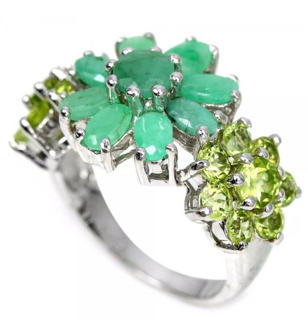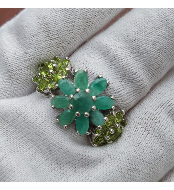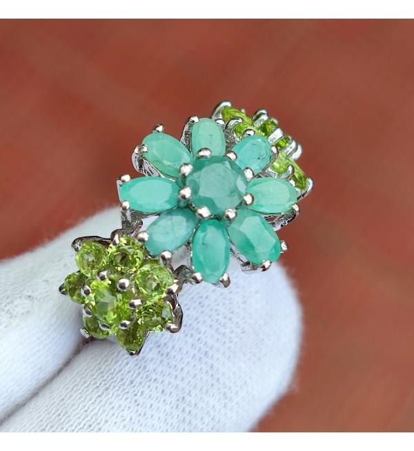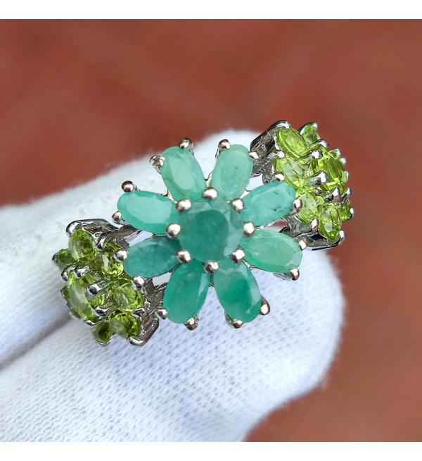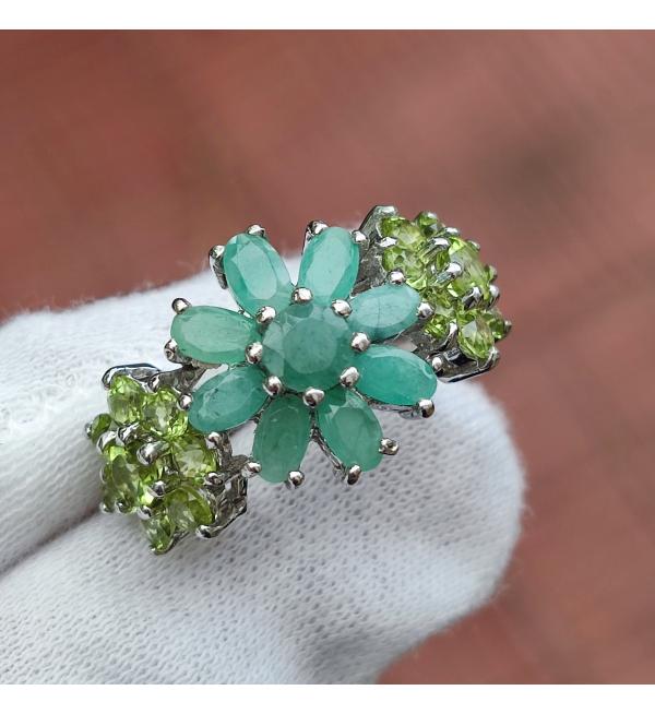 Серебряное кольцо с натуральным изумрудом и хризолитами